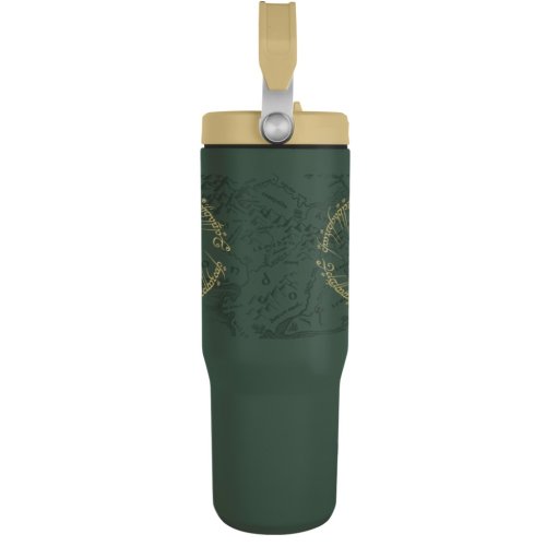 Pán prstenů cestovní hrnek s uchem představuje praktický a stylový doplněk pro fanoušky slavné filmové ságy. Hrnek má objem 850 ml, což je ideální velikost pro dlouhé výpravy, práci či každodenní použití na cestách. Jeho tělo je zhotoveno v tmavě zelené barvě, která evokuje atmosféru Středozemě, a je zdobeno detailní mapou tohoto fiktivního světa. Na povrchu hrnku je rovněž viditelný motiv Prstenu s nápisy v zlaté barvě, které vytvářejí elegantní a tematicky věrný design.