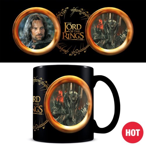 Keramický hrnek s motivem Pána prstenů nabízí objem 325 ml a zaujme především svým unikátním efektem měnícího se vizuálu podle teploty nápoje. Při studeném nápoji je na hrnku viditelný portrét Aragorna, jednoho z hlavních hrdinů série, který je rámován zlatým prstenem s elfským písmem. Po nalití horkého nápoje se tento obraz změní a objeví se temná postava Saurona v jeho plné zbroji, což vytváří působivý kontrast a tematické napětí.