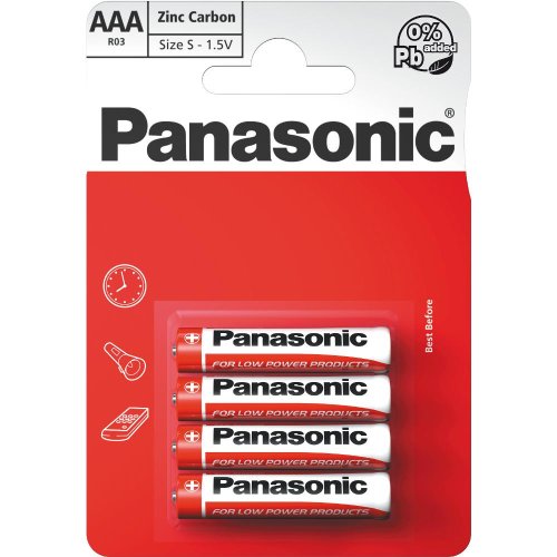 Zinkouhlíkové baterie Panasonic poskytují finančně výhodný zdroj energie pro zařízení s nízkou energetickou náročností. Jednoduchá a spolehlivá technologie. Vynikající poměr kvalita/cena. Finančně výhodná vzhledem k nákladům na hodinu provozu zařízení s nízkou energetickou náročností. Celistvá a přehledná produktová řada.