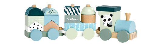 Dřevěný vláček s 2 vagónky a 13 kostičkami různých tvarů. Délka 29 cm. Materiál bříza.