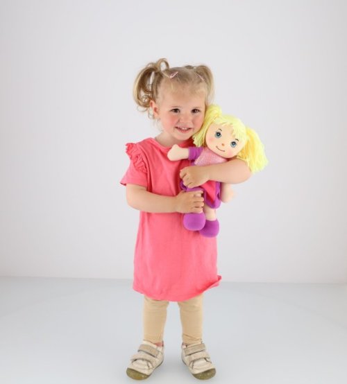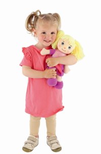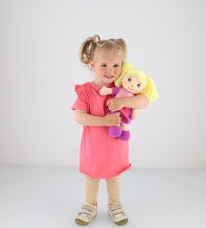 Panenka látková s blond culíky v šatičkách. Díky měkkému tělíčku i hlavičce může být kamárdkou nejen při hraní, ale také při usínání. Velikost panenky cca 30 cm Vhodné pro děti od 0 měsíců