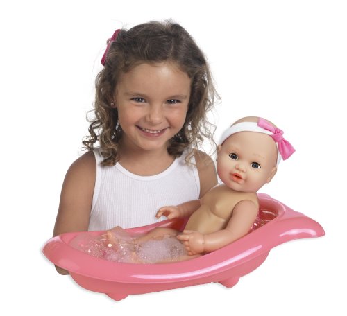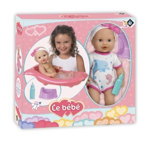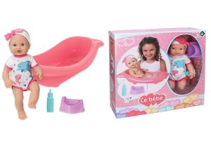Panenka čurající set s vaničkou. Velikost vaničky 41cm. Obsahuje panenku, lahvičku, nočník, vaničku. Panenka má pohyblivou hlavu a končetiny. Při položení na záda zavře oči.