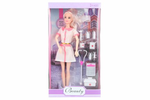 Panenka doktorka. Balení obsahuje panenku o velikosti cca 29 cm s kloubovýma rukama a zdravotnické doplňky (stetoskop, injekci, kufřík, lahvičky a další doplňky). Rozměr balení cca 18 x 32,5 x 5 cm. Věk 3+