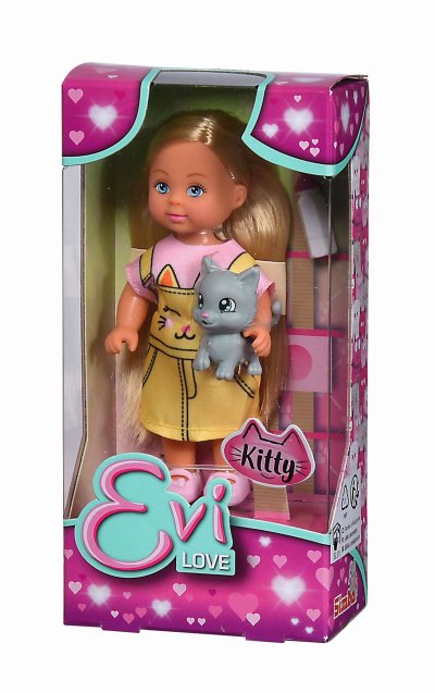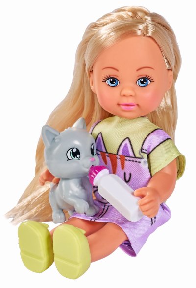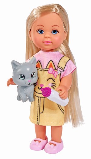 Panenka Evička v roztomilých kočičích šatech s kočičkou a lahví na pití. Velikost panenky 12 cm.
