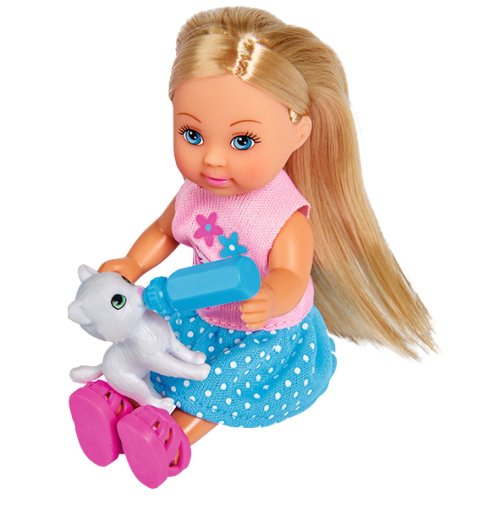 Panenka Evička se 2 roztomilými kočičkami a kočárkem s odnímatelným košíkem a doplňky. Velikost panenky 12 cm.