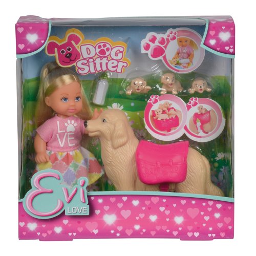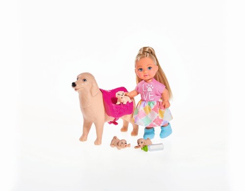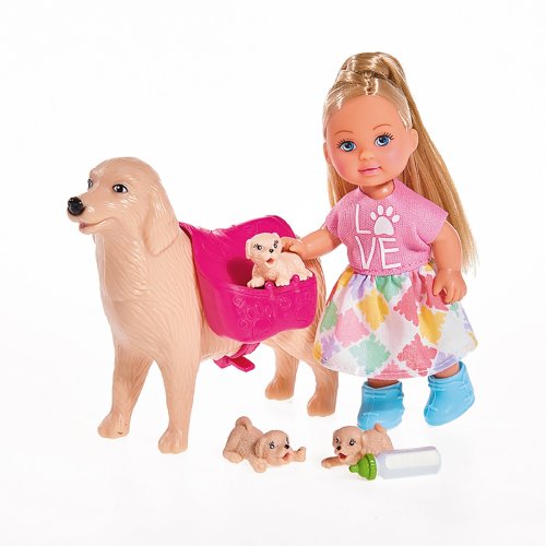 Panenka Evička se svým pejskem a 3 štěňátky. Příslušenství součástí. Velikost panenky 12 cm.