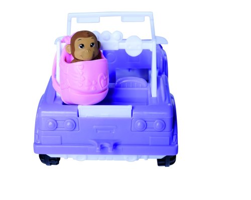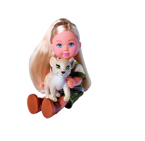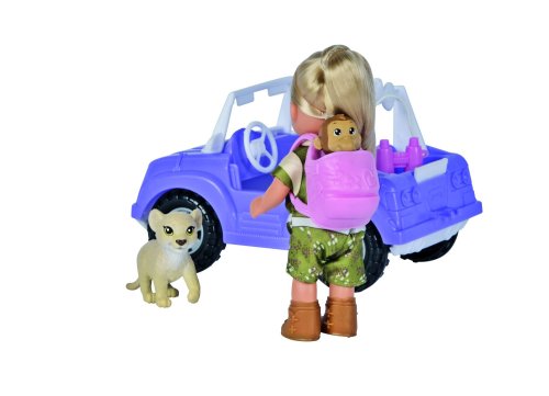 Panenka Evička v safari oblečení a s terénním autem. Nechybí batůžek, malá opička, lvíček a dalekohled. Délka auta 16 cm. Výška panenky 12 cm.