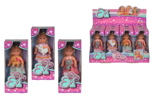 Panenka Evička má svého zvířecího mazlíčka. 3 druhy zvířátek: králíček, pejsek nebo kočička. Výška panenky 12 cm.