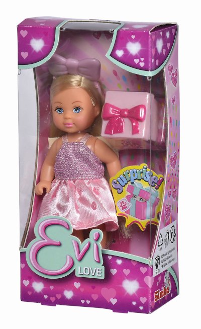 Panenka Evička v roztomilých třpytivých šatech s mašlí. Součástí je krabička s překvapením, ve které je štěňátko. Velikost panenky 12 cm.