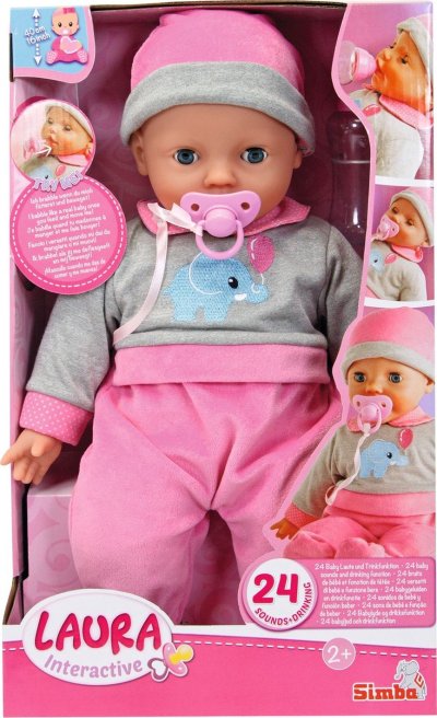 Panenka Laura má měkké tělíčko, zavírací očíčka, pije z lahvičky a vydádá 24 dětských zvuků.