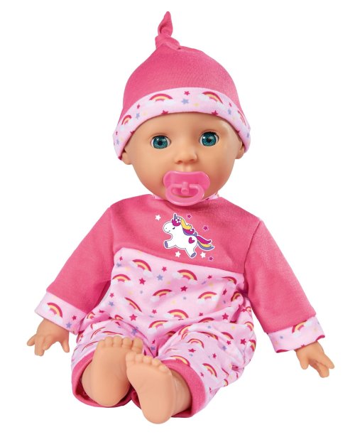 Panenka s měkkým tělíčkem, s 25 dětskými zvuky jako „mama“, „baba“, "hihi“ a mnoha dalšími, s dudlíkem, mrkacíma očima. Výška panenky 38 cm.
