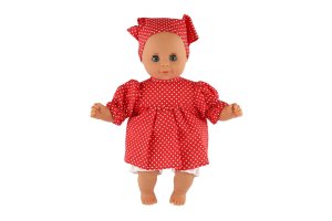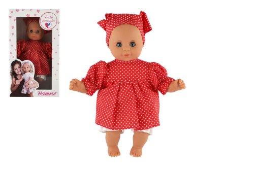 Roztomilé miminko v šatech s šátkem si oblíbí každá malá holčička, která si chce hrát na maminku a starat se o své miminko. Miminko má látkové tělo. Délka 30 cm. V krabici 20x35x13 m.