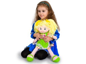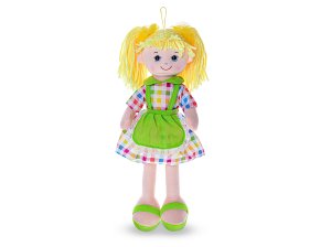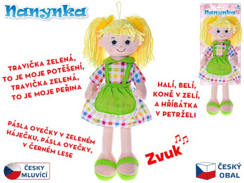 Látková panenka potěší každou holčičku. Panenka umí mluvit a zpívat písničky: "Halí, belí…", "Travička zelená...", "Pásla ovečky v zeleném háječku…". Žlutá panenka Nanynka má 50 cm. Vhodné pro děti od narození.