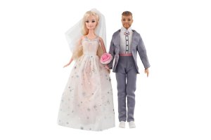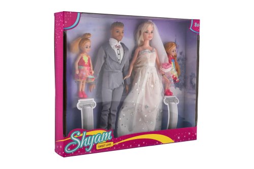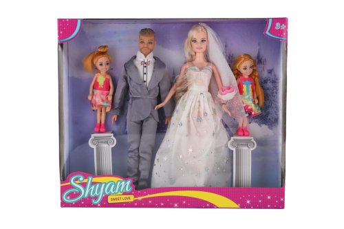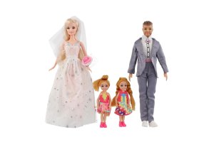 Sada panenek – Nevěsta, ženich a jejich děti . Elegantní sada figurek pro hravé děti s tématem svatby a rodiny. Obsahuje nevěstu v krásných bílých šatech, ženicha v obleku a dvě malé děti – vše sladěné do svátečního vzhledu. Ideální jako dárek nebo doplněk k panenkovému světu.