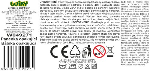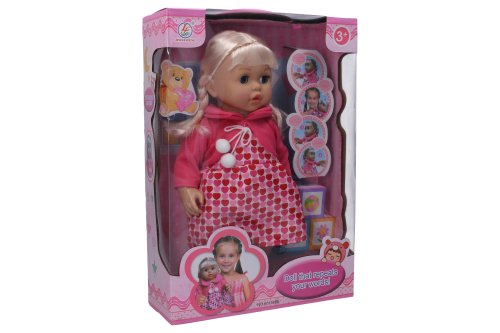 Panenka opakující. Velikost 40cm. 2xAA baterie nejsou součástí. Návod na obale. Po zmáčknutí pravé ruky zazní zvuk a panenka začne nahrávat. Mluvte k panenčiným ústům. Dalším zmáčknutí pravé ruky zazní dvojitý zvuk a nahrávání je u konce. Zmáčknutím levé ruky panenka přehraje nahrávku.