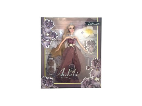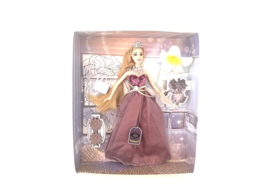 Panenka vysoká přibližně 30 cm je navržena jako elegantní módní figurka, která upoutá pozornost svými luxusními plesovými šaty v odstínu tmavé purpurové s jemným třpytem. Šaty mají korzetový vršek s výraznou mašlí v pase, která ladí s celkovým vzhledem a dodává panence slavnostní a noblesní vzhled. Díky průhledné vrstvě látky na sukni působí šaty velmi vzdušně a noblesně, což podtrhuje jejich vhodnost na různé pohádkové či slavnostní příležitosti.