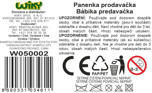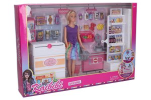Panenka prodavačka. Velikost 30 cm. Obsahuje panenku, regál na zboží, potraviny a zboží, pokladnu s pásem, nákupní košík a další doplňky.