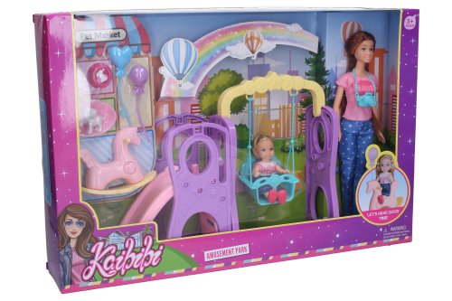 Panenka s dítětem na hřišti. Velikost panenky 30 cm, Obsahuje Panenku, holčičku, houpačku, skluzavku, houpacího koníka, štěňátko a doplňky.