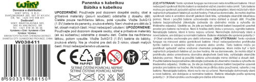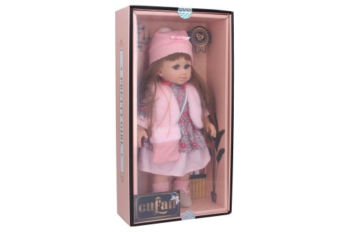 Panenka s kabelkou. Měkké tělíčko. Velikost 38 cm. 3xAG13 baterie, jsou součástí balení.