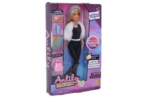 Panenka s kožichem a doplňky. Velikost 29 cm. Obsah balení - panenka, kabelka, náhrdelník, kelímek a sluneční brýle.