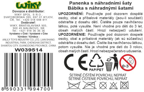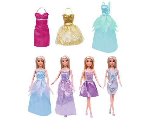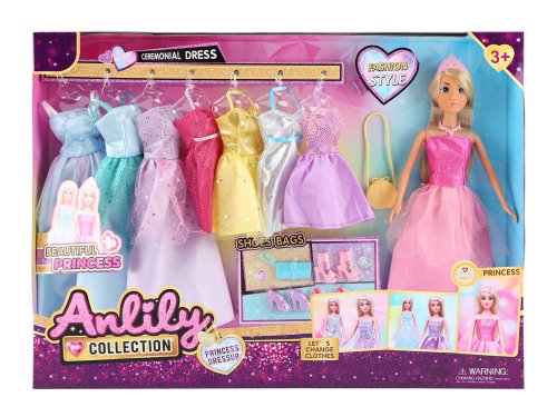 Panenka s oblečením set. Velikost 30 cm. Součástí 7 náhradních šatů, 3 střevíce, kabelka, korunka.