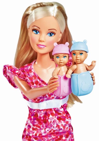 Těhotná panenka Steffi s dítětem jako překvapení a s více než 11 doplňky. Bude to chlapeček, holčička nebo dvojčátka? Velikost panenky 29 cm. 3 druhy.
