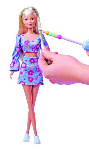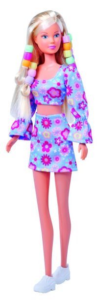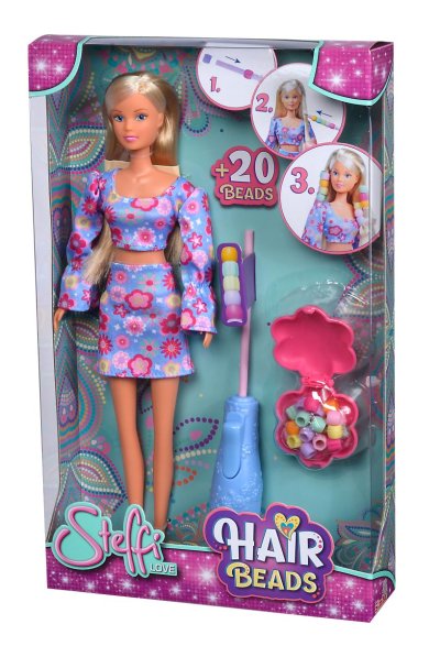 Panenka Steffi v kytičkovém dvoudílném outfitu, s háčkem na navlékání korálku na pramen vlasů, barevnými korálky, gumou na fixaci a hřebenem s úložným prostorem. Výška panenky 29 cm.