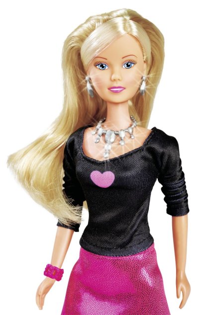 Panenka Steffi v sukni a obchod se šperky. Součástí je 2x náhrdelník, náušnice, náramek, kabelka. Velikost panenky 29 cm.