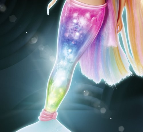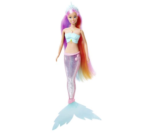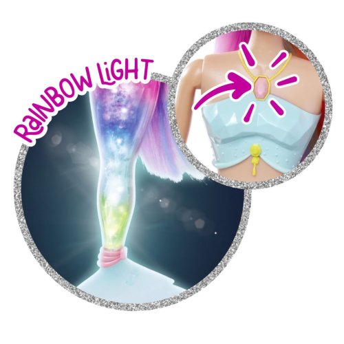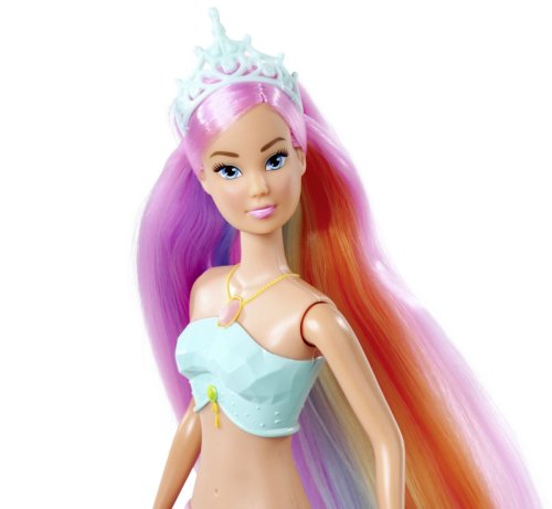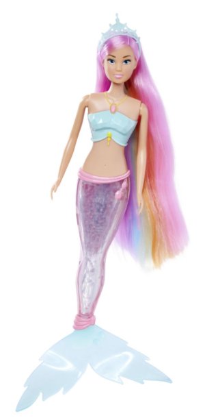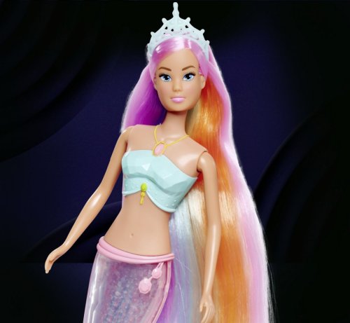 Panenka Steffi jako mořská víla s kouzelnou duhovou světelnou ploutví a extra dlouhými vlasy, voděodolná. Výška panenky 39 cm.