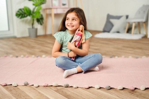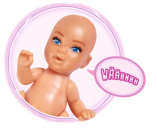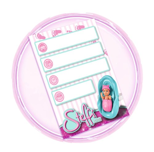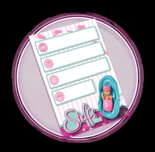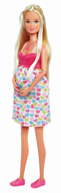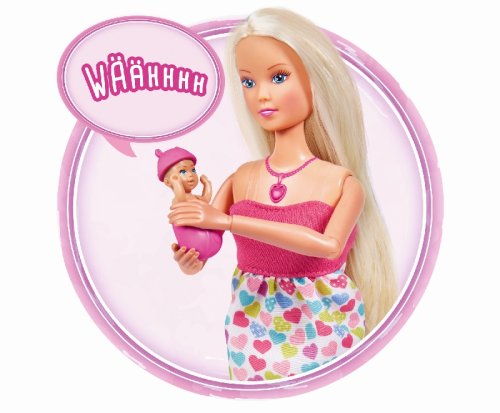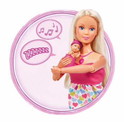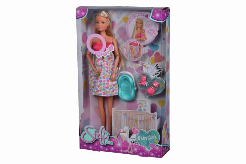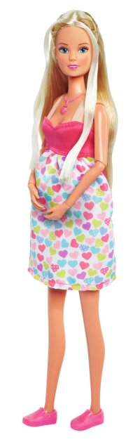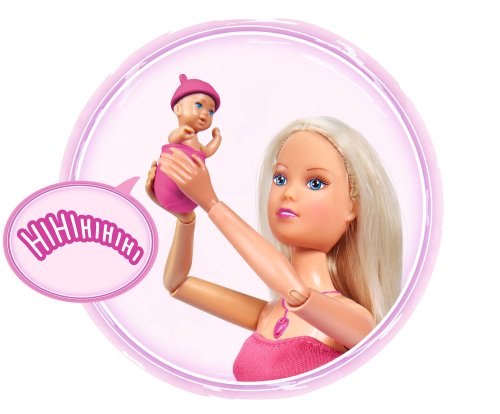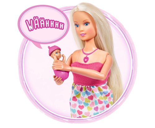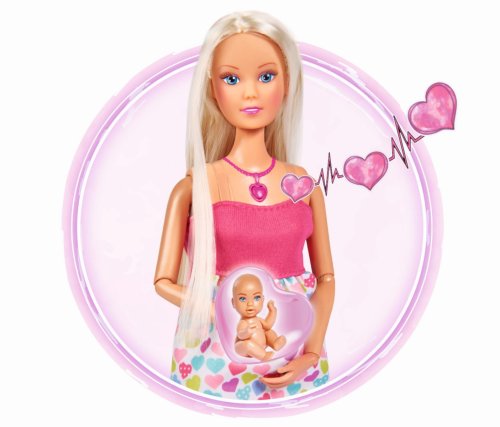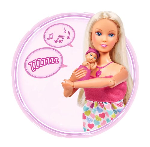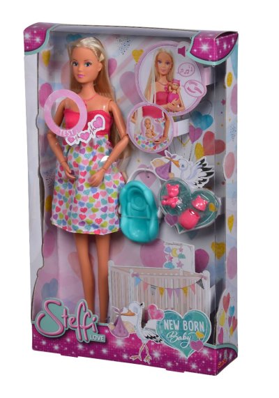 Steffi jako nastávající maminka s miminkem v bříšku. Když stiskneme tlačítko ve tvaru srdce na jejím náhrdelníku, uslyšíme tlukot srdce miminka. Když se dítě narodí a vykoukne z bříška, dá o sobě vědět křikem. Když pak znovu stiskneme srdíčko na náhrdelníku, postupně uslyšíme další zvuky - pláč, usínání při ukolébavce a smích. Sada obsahuje také rodný list k vyplnění, čepičku a zavinovačku pro novorozence, hračku medvídka a dětské nosítko. Panenka Steffi má ohebné klouby na loktech a zápěstích. Velikost panenky 29 cm.