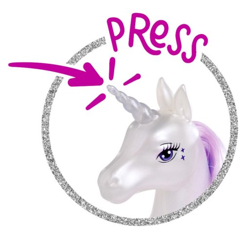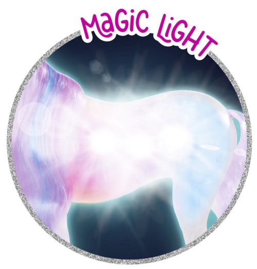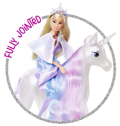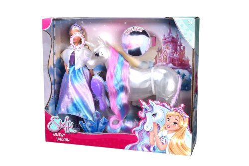 Panenka Stefii v kouzelných šatech jako princezna s jednorožcem, který svítí a má dlouhou hřívu na česání. Výška panenky 29 cm.