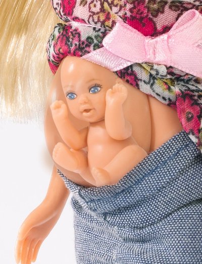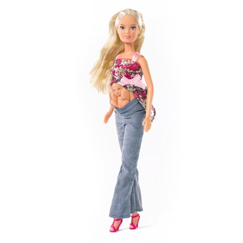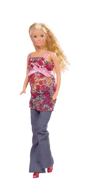 Panenka Steffi - těhotná, s miminkem v bříšku. Bříško panenky lze otevřít a vyndat malé miminko. Součástí 13 ks příslušenství pro miminko.
