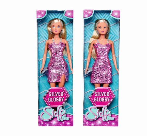 Panenka Steffi v efektních třpytivých šatech s náušnicemi a sponou, 2 druhy. Velikost panenky 29 cm.