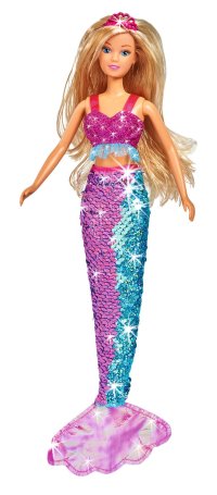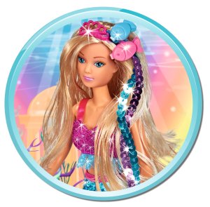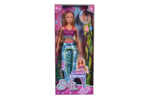Panenka Steffi jako mořská panna se dvěma připínacími vlasovými prameny a ploutví z barevných flitrů se swap efektem. Velikost 29 cm.