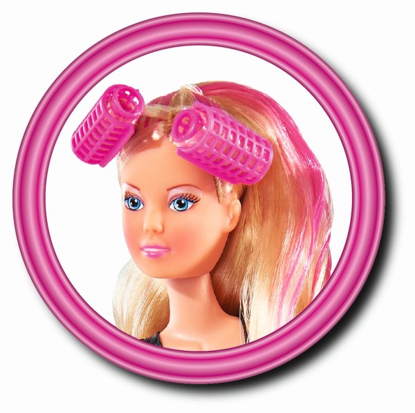 Panenka Steffi s extra dlouhými vlasy s hřebenem, kartáčem, fénem a kulmou. Výška panenky 29 cm.