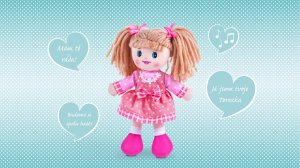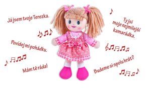 Hadrová panenka Terezka po zmáčknutí bříška povídá: "Mám Tě ráda, Povídej mi pohádku, Já jsem tvoje Terezka, Ty jsi moje nejmilejší kamarádka, Budeme si spolu hrát?..." Rozměr: 30 cm Vhodná pro děti od 0 let Výrobek obsahuje nevyměnitelné baterie.