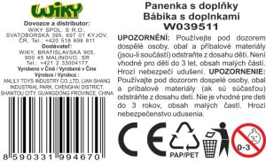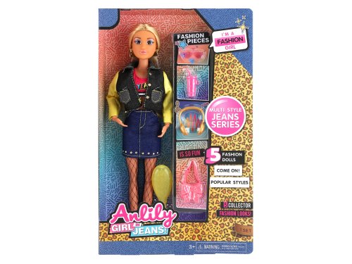 Panenka v denim sukni s doplňky. Velikost 30 cm. Doplňky - brýle, láhev, sluchátka, kabelka, hřeben.