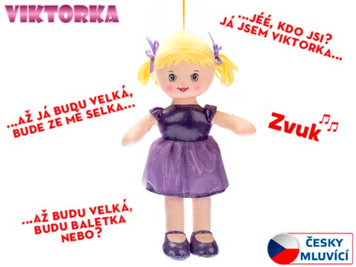 Měkká látková panenka v krásných šatičkách a botičkách, která umí mluvit a zpívat v češtině: "Až já budu velká, bude ze mě selka…". Tuto panenku si oblíbí každá malá holčička. Fialová hadrová panenka Viktorka má 32 cm. Vhodné pro děti od narození.