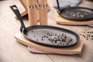 Pánev 23 x 14 cm GRADA, litina + dřevěné prkénko.