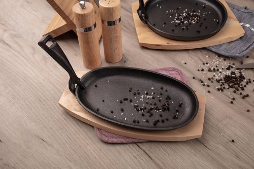 Litinová pánev na dřevěném prkénku, pánev má odnímatelné litinové držadlo na vyndávání pánve z trouby. Pánev je vhodná pro zapékání pokrmů, lze jí použít pro přímé servírování, dřevěné prkénko slouží jako podložka pod horkou pánev.