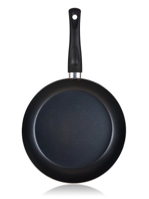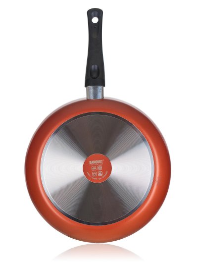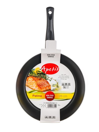 Hliníková pánev PATINA 28 x 5 cm s nepřílnavým 2vrstvým povrchem XYLAN a černou bakelitovou nýtovanou rukojetí. Lehká pánev pro použití na všechny typy varných desek mimo indukce.