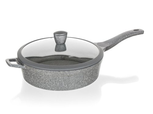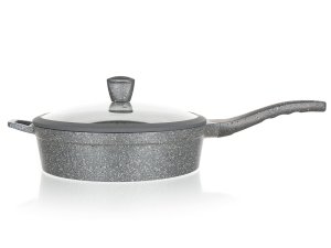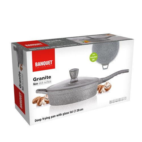 Hliníková hluboká pánev MARRONE o průměru 28 cm je opatřena vnitřním nepřilnavým povrchem, který zabraňuje připalování jídel při vaření. Pánev je vybavena skleněnou poklicí s knobem se silikonovým povrchem, který zajišťuje ochranu proti popálení při vaření. Ergonomická rukojeť se soft-touch povrchovou úpravou zaručuje snadnou manipulaci. Dno pánve je ošetřeno žáruvzdorným granitovým nástřikem. Pánev je dodávána v šedé barvě s granitovým dekorem.