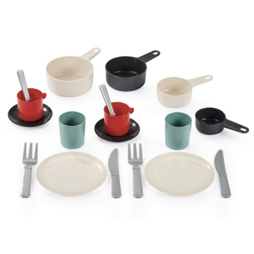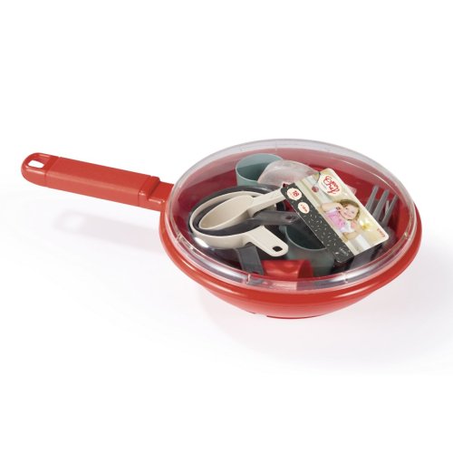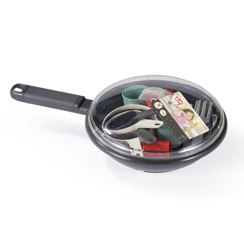 Pánvička s pokličkou a sadou nádobí obsahuje talíře, příbory, hrníčky, lžičky a další. Vyrobeno ve Francii. Materiál plast. Průměr pánvičky cca 20 cm. Barva černá nebo červená.