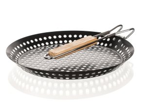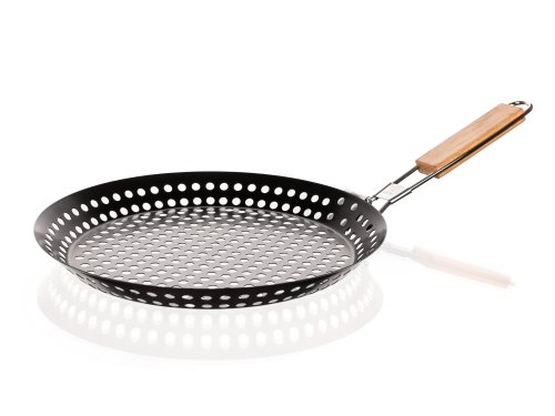 Grilovací pánev je ideální ke grilování ryb, masa a zeleniny. Je vyrobena z ušlechtilé oceli. Díky nepřilnavému povrchu se grilované potraviny z pánve snadno vyjímají. Praktická je sklápěcí dřevěná rukojeť s kovovým rámem a závěsným očkem. Specifická konstrukce pánve s otvory zajistí rovnoměrné grilovaní potravin a pomohou rozvinout vůně typické pro grilování.