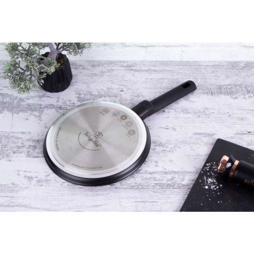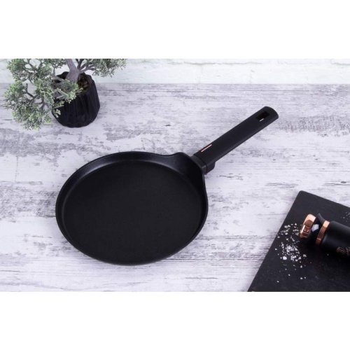 Pánev na palačinky s titanovým povrchem v šedém designu Monaco Collection. Moderní minimalistický design pánve vás jistě zaujme hned na první pohled. Matný béžový povrch pánve je navíc velmi praktický při dlouhodobém používání. Vnitřní vrstva je potažena 3vrstvým titanovým povrchem, který je charakteristický svou dokonalou nepřilnavostí. Připravované pokrmy se tak nepřipalují a díky tomu se pánev velmi snadno čistí. Zároveň je vhodný pro zdravé vaření s minimem tuku nebo oleje, v závislosti na použitých surovinách klidně i bez jedinné kapky tuku. Titanový povrch, stejně jako ostatní použité materiály, neobsahují žádné škodlivé látky, vaření je tak zcela zdravé a hygienické. Zesílené Turbo indukční dno z nerezové oceli je kompatibilní se všemi druhy varných desek a spolehlivě funguje také na indukci. Jistě oceníte tepelně izolovanou rukojeť, která se při vaření nezahřívá a zůstává stále chladná. pánev Matte Black je vhodná pro každodenní vaření, dušení i smažení, perfektně bude vypadat i při servírování hotových jídel přímo na váš stůl.