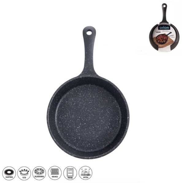 Odlévaná masivní pánev s velmi kvalitním nepřilnavým povrchem PFLUON GRANIT. Můžete na ni smažit, dusit, opékat s minimální potřebou tuku, připravíte jíšku, vajíčka (menší porce). Tato celokovová pánvička nabízí možnost zapékání v troubě a následně servírování na prkénku. Materiál hliník s vynikajícím nepřilnavým povrchem PFLUON GRANIT a s profilovaným dnem. Možnost zavěšení. Průměr 18 cm, vnější průměr 19 cm, výška 5.3 cm, celková výška 6.7 cm, celková délka 30.5 cm. Vhodná na všechny typy spotřebičů včetně indukce a trouby. Lze mýt v myčce na nádobí, avšak vlivem agresivních čisticích prostředků může dojít k nepatrné oxidaci dna. Tento stav nemá vliv na proces vaření, není zdravotně závadný a nemůže být důvodem reklamace. Pokud se chcete tomuto vyhnout, nádobí v myčce nemyjte. Doporučujeme použití kuchyňské chňapky, držadlo pálí, dbejte zvýšené opatrnosti. EAN 8592381215101