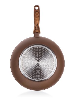 Kovaná hliníková WOK pánev SMART STONE BRICK, s bakelitovou rukojetí se soft touch povrchovou úpravou, v imitaci přírodního dřeva.