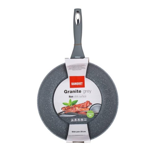 Hliníková litá kovaná pánev WOK GRANITE GREY s nepřílnavým povrchem. Šedý granitový dekor, soft - touch rukojeť. Nepřilnavý povrch je velmi tvrdý a odolný proti poškrábání. Vysoká tepelná vodivost zajišťuje rychlé a ekonomické vaření - dlouho drží teplotu. Pánev je odolná proti nárazu a deformaci tvaru. Je vhodná na všechny typy varných desek včetně indukce.