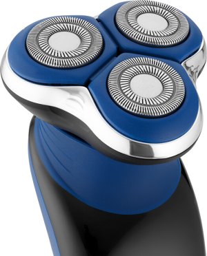 Holicí strojek s hlavicí se třemi rotačními břity z nerezové oceli.