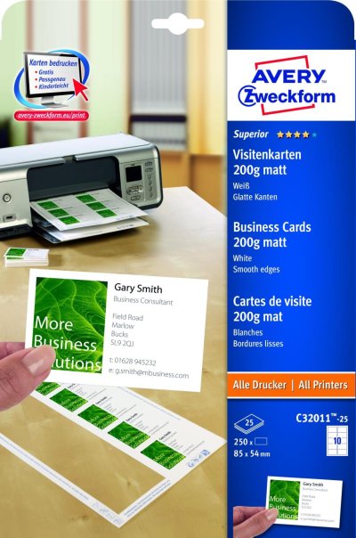 Obchodní vizitky Avery Zweckform - matné bílé vizitky vhodné pro inkoustové i laserové tiskárny a kopírovací stroje Díky technologii Quick &; Clean™ si zhotovíte vizitku na profesionální úrovni stejně …